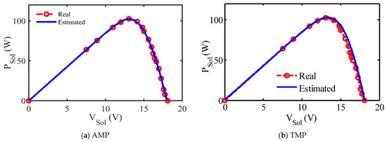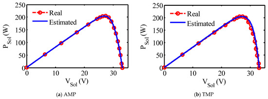 In the same manner, the P/V plots are displayed in Figure 8a and Figure 9a for KC200GT and P-120 modules using AMP, correspondingly, while Figure 8b and Figure 9b display the P/V plots using TMP. Once more, well-coinciding amongst 3-DM along with the analogous measured values is recognized when using AMP more than that when using TMP. Operational measures are prepared through parametric tests to attest the dynamism of the BMOA results using AMP.