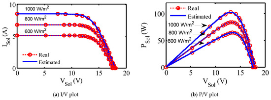 The I/V and P/V plots of the P-120 SGS module need to be measured at various irradiances and temperatures to show that the extracted Ups of the 3-DM of SGSs using BMOA at RAC are functioning efficiently at various conditions. In Figure 10, G is 1000 W/m2, 800 W/m2, and 600 W/m2, while has a constant value of 25 °C. It is seen that the irradiance augmentation leads to an increase in the produced current and power of SGS.