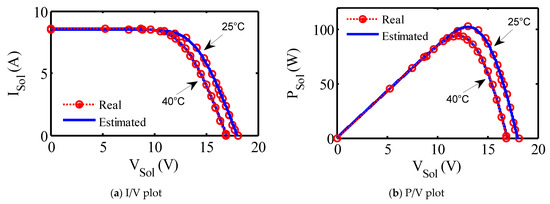 Subsequently, the influence of temperature variation is displayed in Figure 11, where is 40 °C and 25 °C, (while G has a constant value of 1000 W/m2). It is apparent that the rise in temperature causes a reduction in the produced voltage and power of the SGS module.
