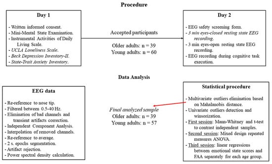 Data collection was carried out on two different days (see Figure 1). On the first day, the participants signed the informed consent and completed the cognitive and emotional status assessment questionnaires, and it was confirmed if the participants fulfilled all the requirements for inclusion in the sample of the study. In the second session, the participants filled out an EEG checklist (to ensure participants’ safety) and then underwent an EEG recording. The EEG recording took place while participants were seated in a comfortable armchair located in a light- and sound-attenuated room. EEG data collection started with a 3 min eyes-closed resting state condition, followed by a 3 min eyes-open resting state condition. The session finished with EEG data collection during the execution of a cognitive task. For the present study, only data from the resting-state eyes-closed condition were used.