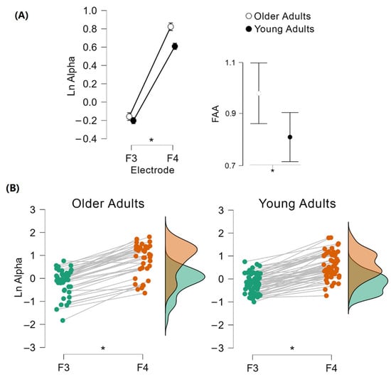 Comparison of frontal alpha asymmetry (FAA) values between YA and OA. Mann–Whitney test revealed hemispheric activity differences between groups: OA presented higher FAA than YA (A). Mixed repeated measures ANOVA showed a significant main effect for the hemisphere; the right hemisphere presented a higher alpha activity for both age groups (B). * p ≤ 0.05.