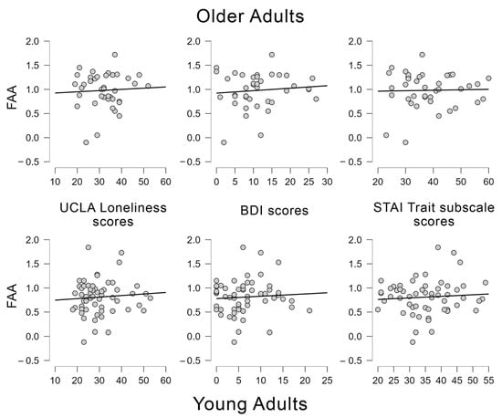Scatter plots showing the regression analyses conducted between frontal alpha asymmetries (FAA) and UCLA loneliness scores, BDI scores and STAI Trait subscale scores for younger and older adults.