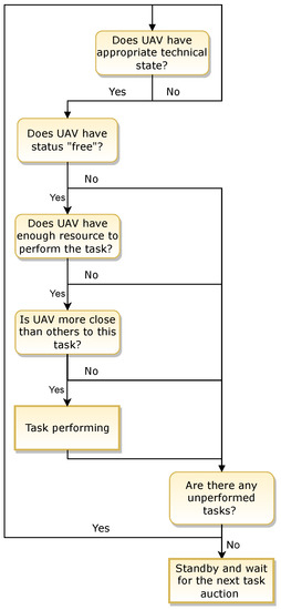 The task is assigned to the UAV only in the case that it corresponds to all the conditions, set by the rules listed above. The task allocation auction is schematically represented in Figure 1. It incorporates several steps, the aim of which is to allocate the task to the most suitable UAV in terms of the distance, current resource balance, and technical condition. The auction’s steps are described in more detail below.
