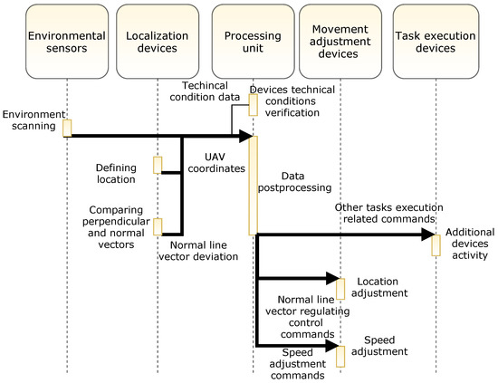 Considering the internal II in the UAV as a chain of information flow (Figure 2), it can be supposed that space-movement control components and additional devices are the most vulnerable to DII, because they are located at the end of this chain. Therefore, in the case of DII on the previous components in the chain, further modules gather and process falsified data, which is likely to significantly affect the UAV group’s performance. Figure 3 represents the concept of UAV internal II between the UAV system components. In this paper, we represent UAV as a system, which integrates the following components: