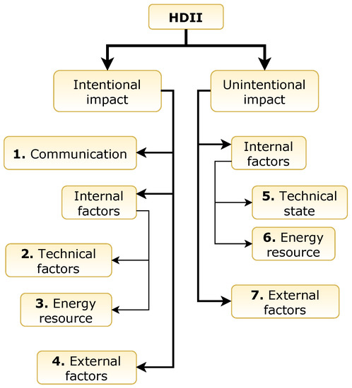 HDII can be classified as intentional or unintentional. In Figure 4, we schematically represent the classification of the HDII types by a vulnerable component from which HDII originates from. The intentional impact is implemented to decrease the UAV group performance by a malicious UAV or a third party. The unintentional one occurs in cases of technical faults in the UAV’s hardware or software components. Connection type factors, internal and external factors can be used to identify the HDII type.