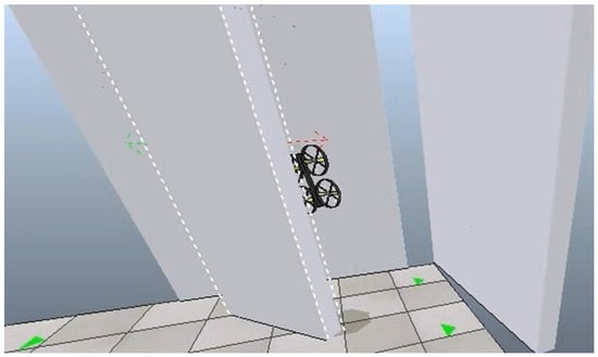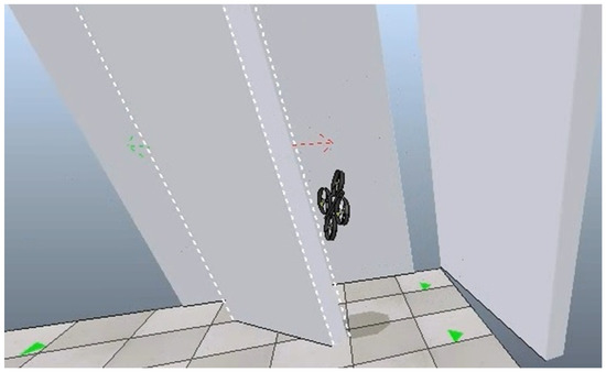 In the case of UAV’s sensor malfunction during the process of environmental data gathering, proper obstacle position detection can fail. Therefore, this negative effect relates to DII. For the illustration purposes, we outline the key moments of the empirical study: corridor entry (Figure 5); collision with an obstacle due to the DII caused by the ultrasonic range finder, which results in improper command generation by the PU (Figure 6); UAV crash, caused by the destructive impact on the system components (Figure 7).