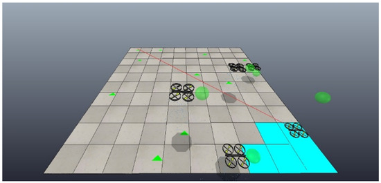 The UAVs group consists of five participants. In the initialization moment, they are located in zone A, painted turquoise in Figure 8. The aim of each UAV is to reach the finish point, where the “flag” is located (represented as green triangles in Figure 8, Figure 9 and Figure 10) and to return to the zone A in the most optimal way (in terms of distance). The goal of the whole group is to perform 10 abstract tasks (to reach the “flag” and return to the zone A).