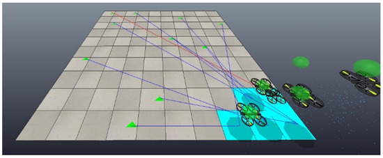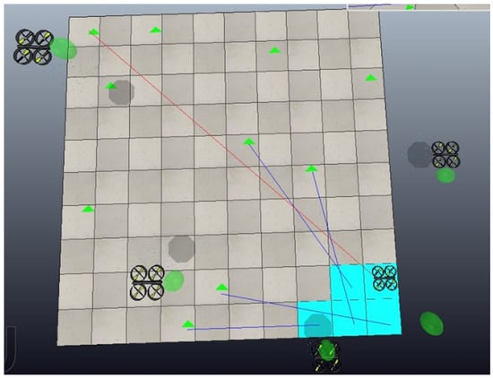For our particular simulations, we assume the remaining unperformed tasks as a consequence of DII provided by one of the UAVs. Moreover, such a UAV can also provide HDII by transmitting false data to other group participants. Such informational messages cannot be identified as falsified ones by other group participants, which leads to sub-optimal decisions. Furthermore, such false data results in the group tasks’ performance decrease, which can be demonstrated by our experiments. The inability of UAV group participants to identify this data as false allows us to classify this impact as hidden. The key moments of the performed empirical study are illustrated in Figure 8, Figure 9 and Figure 10.
