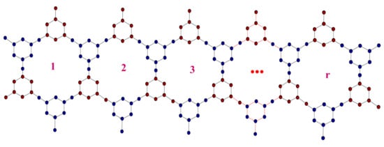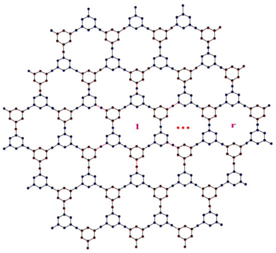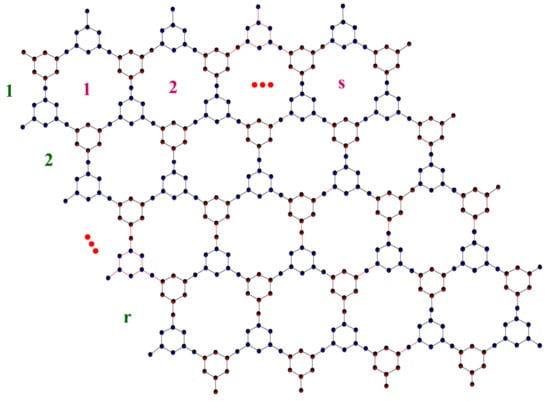 In this section, the authors present key findings of the study. A schematic of triazine-based covalent-organic frameworks synthesis can be formed into any kind of structure, such as a linear chain, parellelogram, hexagonal shape, etc. Linear chain triazine-based covalent-organic frameworks, parellelogram triazine-based covalent-organic frameworks, and hexagonal triazine-based covalent-organic frameworks are here denoted as TriCF(r), TriCF(r,s), and TriCF(r), respectively. Figure 2, Figure 3 and Figure 4 show the 2D structure of linear chain, parellogram, hexagonal TriCF structures respectively. Figure 5 shows the unit cell of TriCF and explains the edge partition method. In this work, based on the growth of TriCF, the authors categorized it into three kinds. In particular, , and are linear chain TriCF structures, parellelogram TriCF structures and hexagonal TriCF structures, respectively.