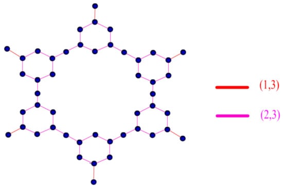- The total number of vertices and edges of is depicted as = and = , respectively. In addition, the edge set has two edge partitions. The first edge partition contains edges with the following values: ; = 1, = 3 and edges make up the second edge partition, where = 2, = 3.