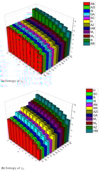In an effort to describe the complexity of graphs, graph entropy was developed. Although it was initially developed to illustrate the complexity of information transmission and communication, it currently has numerous important applications in a variety of scientific fields, including physical dissipative structures, biological systems, engineering fields and others [8]. Graph entropies can be divided into two categories: deterministic and probabilistic [7,8,9,10]. Since it is frequently used in a variety of fields, including communication and the characterisation of chemical structures, this work focuses on the probabilistic category [9,11]. Statistical techniques are further divided into intrinsic and extrinsic groups. In intrinsic measures, a graph is divided into parts with similar structural similarities, and a probability distribution over those parts is discovered. For extrinsic measurements, vertices or edges in the graph are given a probability function [11]. Applying an entropy function to this probability distribution function yields the numerical value of probabilistic measurements of graph complexity [7,8,9,10,11,12,13].