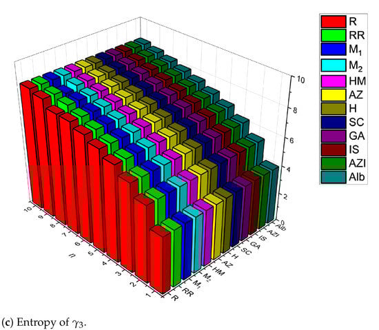 This section explains how to calculate entropy values using Shannon’s method by creating the probability function using degree-based topological indices. To calculate probabilistic entropy, we utilised Shannon’s model because it is the most popular approach [7,11,13,31]. The entropy measured using that topological index X is given by