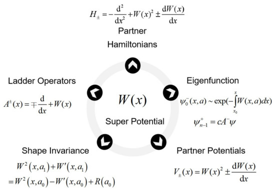 - Cooper, F.; Ginocchio, J.N.; Khare, A. Relationship between supersymmetry and solvable potentials. Phys. Rev. D 1987, 36, 2458. [Google Scholar] [CrossRef]
