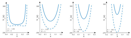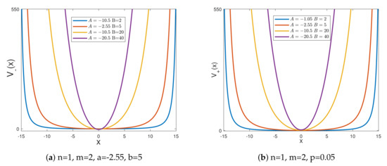 From Figure 3, it can be seen that, whatever values A and B take, the shapes of the partner potentials and are similar, so they conform to the shape invariance relationship described in Section 1.