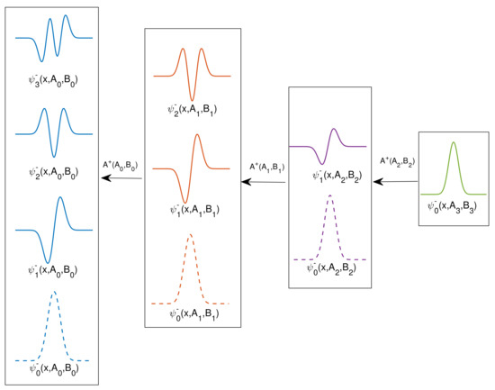 where , and are the normalization coefficients. Some of the eigenfunctions and their relationships are shown in Figure 5.
