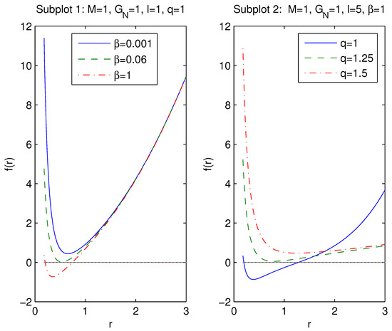 Making use of Equation (12), at , one finds the metric function of the Reissner–Nordström space-time. From Equation (12), one can obtain corrections to the Reissner–Nordström black holes in the order of . In Figure 1, the plots of the metric function (11) are depicted at and for different parameters.