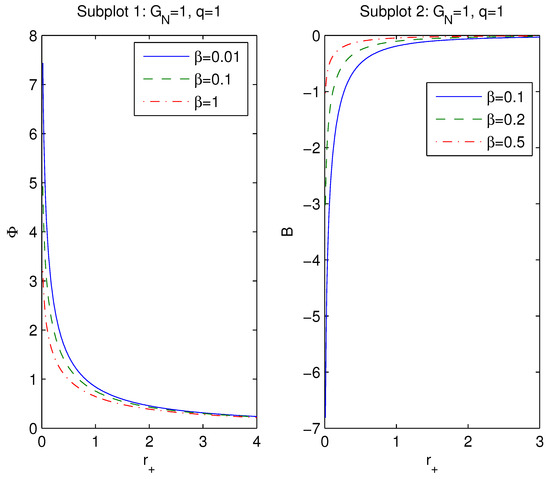 In Figure 2, subplot 1 shows that, when the coupling increases, the magnetic potential decreases, and at , it vanishes (). In accordance with subplot 2 of Figure 2, when the parameter increases, the vacuum polarization decreases, and as , we have . Making use of Equations (14), (15), (19), and (21), one can verify that the generalized Smarr relation holds: