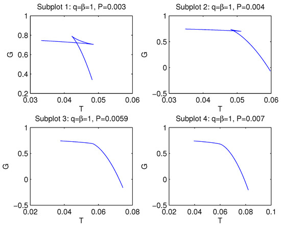 We will study the dependence of the Gibbs free energy G on the temperature T for different fixed () values. The plots of G versus T, where we took into account that is a function of P and T (see Equation (23)), are depicted in Figure 4.