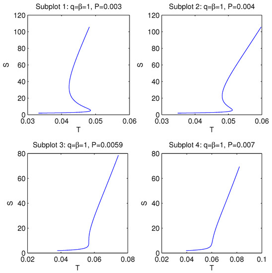 Subplots 1 and 2 in Figure 4 show first-order phase transitions between small and large black holes. The Gibbs free energy at has a “swallowtail” behavior. The points on the curves correspond to different event horizon radii of black holes. At the critical point— (), , and at in subplot 3—a second-order phase transition takes place. Subplot 3 shows that there is a cusp at the critical point. Hence, the second derivative of the Gibbs free energy G with respect to temperature T is discontinuous at that point. We check this analytically in Appendix A. The behavior is similar to that of the Reissner–Nordström–AdS black hole. In subplot 4, for , only a single phase exists, and we have a smooth single-valued curve. Plots of entropy S versus temperature T at are depicted in Figure 5. According to subplots 1 and 2 of Figure 5, the entropy is an ambiguous function of the temperature for some regions. This confirms that, for such a region, first-order phase transitions occur. Subplot 3 of Figure 5 shows the second-order phase transition, where the tangent of the slope at the critical point at , , and is infinite. The critical point separates a low-entropy state and a high-entropy state. In accordance with subplot 4 of Figure 5, there is not a critical behavior of a black hole.