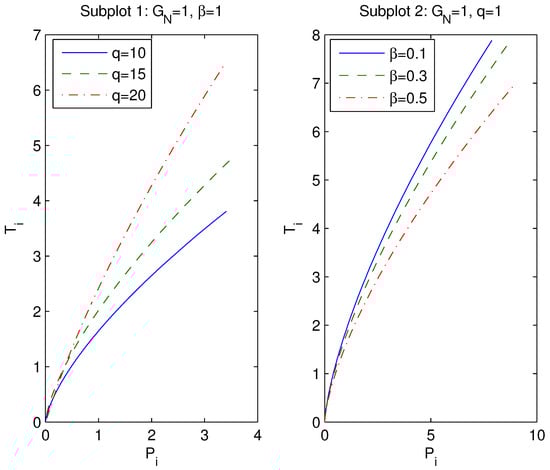 Equations (36) and (37) are equations for the inversion temperature versus in the parametric form. The plots of versus are depicted in Figure 7. According to subplot 1 of Figure 7, the inversion temperature increases with q. Subplot 2 of Figure 7 shows that the inversion temperature decreases when the coupling increases.
