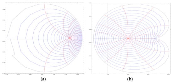 In [], Karthikeyan et al. have showed that convex function becomes starlike by varying the parameters in . Hence, the function may be convex univalent or starlike univalent depending on the function . It cannot be concluded that impact of on a convex region does not affect the convexity. However, if is to be convex univalent, it is always possible to find a function χ such that is convex univalent in . For example, if we choose then is convex univalent in for all admissible values of the parameters involved. It is well-known that is convex univalent in (see Lemma 2.5 []), the function does not alter the conic except for translation, magnification, and rotation. That is, it does not affect the convexity or univalence as we vary the parameters involved (see Figure 2a–d).