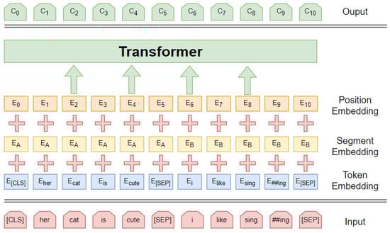 The BERT model outputs both sentence-level and character-level feature vectors. As shown in Figure 6, the leftmost output of the model (CLS) represents the sentence vector that contains the semantics of the whole sentence, and the remaining parts represent the vector output of each character. The BERT model consists of a twelve-layer Transformer network, which mainly uses the Encoder part of the Transformer network. In the Encoder part, the attention mechanism is used to calculate the Input-Output relationship and to learn features that cannot be learned by the shallow network through a deeper network level.