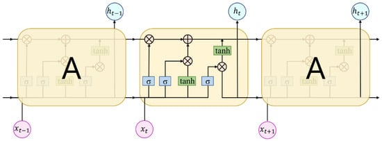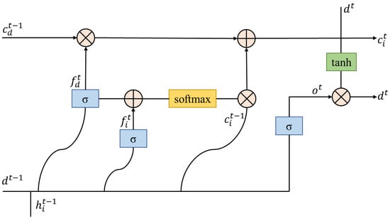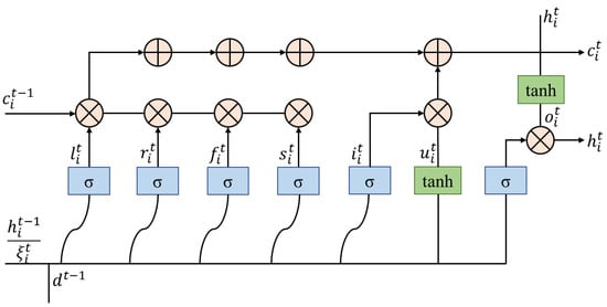 Figure 4 presents the LSTM operation flow of the hidden state, , whose update rules are shown in Equations (1)–(11):