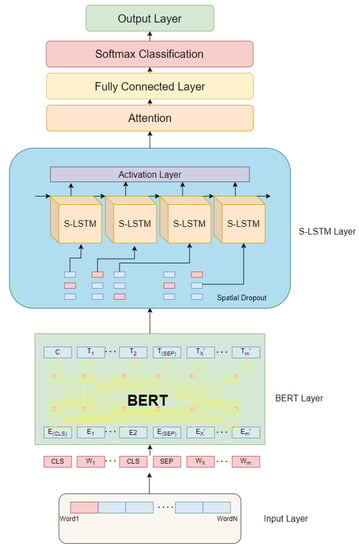 In recent years, BERT [6] has become a state-of-the-art (SOTA) Natural Language Processing (NLP) model. It uses a pretraining task to obtain a priori semantic knowledge from a large unlabeled corpus and transfers this knowledge to the model to improve semantic feature extraction. With the classification function of BERT, Bedi et al. [7] developed a model to propose sentiment and complaint classifications based on energy-related tweets. Lin et al. [8] combined ensemble learning methods with text sentiment analysis to obtain a model based on BERT to identify harmful news, providing readers with a method to identify harmful news content. There are many asymmetric entity relationships in long sentences, so it is a challenge to construct comprehensive and reasonable entity features. In addition, sentiment analysis of Chinese is still a challenging task due to the lack of physical separation between Chinese words.