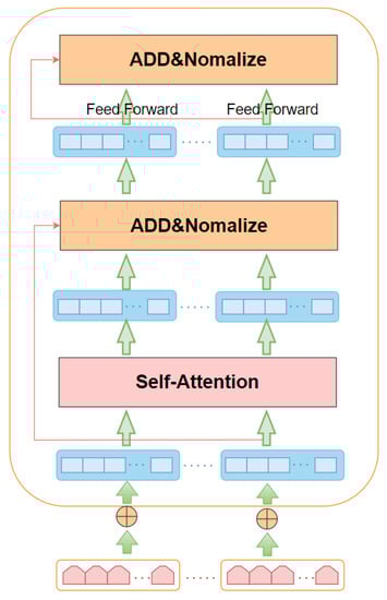 The structure of each Transformer in the BERT model is shown in Figure 7. The Transformer consists of several overlapping units, and each of them is composed of two parts: a self-attentive mechanism and a feedforward neural network. The Self-Attention mechanism helps the current node to focus on the current word and obtain the semantics of the context. Each of these sub-layers incorporates a residual network and a normalization operation.