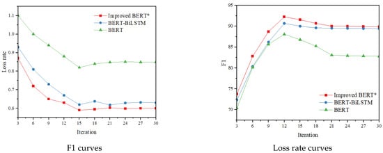 The F1 and loss rate changes of BERT, BERT-BiLSTM, and our method on both the original dataset and the data-enhanced balanced dataset in 30 iterations are shown in Figure 8.