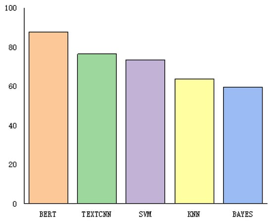 Experiments were conducted on the balanced dataset, and the BERT model proposed in this paper was compared with the Convolutional Neural Network for Text Classification (TextCNN) and traditional machine learning models, including support vector machine (SVM), k nearest neighbors (KNN), and BAYES. The experimental results are shown in Table 5 and Figure 9.