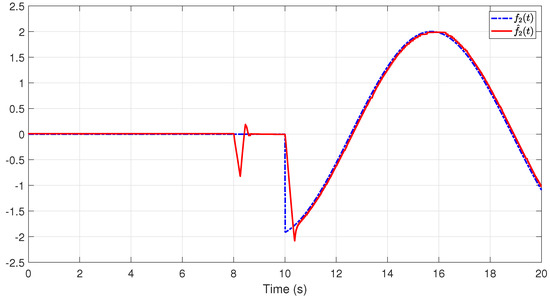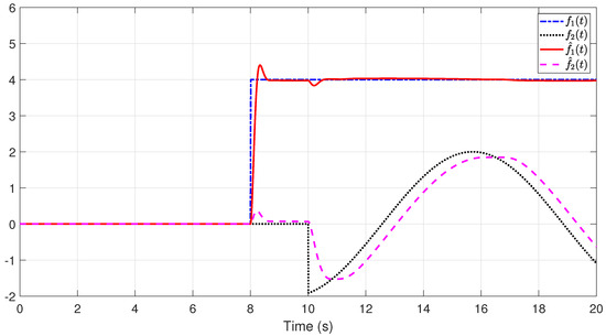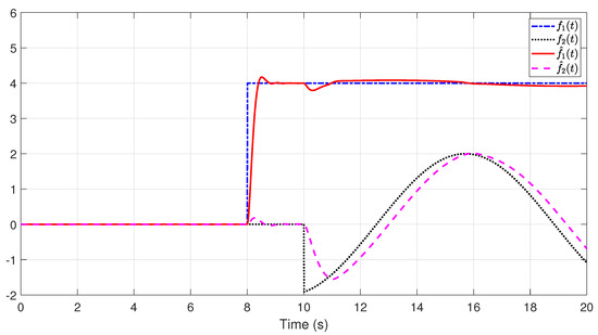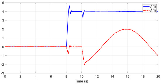 The other parameters of the fixed-time fault estimation observer are selected as , , and . Therefore, the non-linear term in the UIO-based fault estimation observer (11) is . The parameters of the fault estimator are , and .