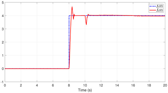 The real fault value is compared with the estimated value, as shown in Figure 2 and Figure 3, to verify the effect of fault estimation. The proposed fixed fault estimator has a rapid fault estimation effect, regardless of a constant or a time-varying fault.