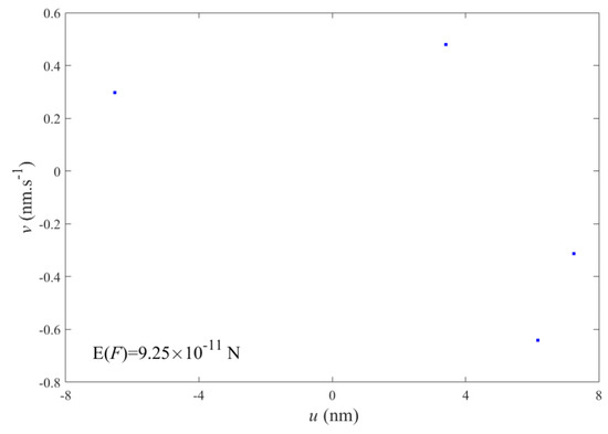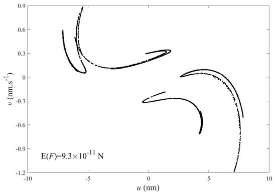 For the existence of the stochastic parameters and the external stochastic excitation, the analytical condition of the existence of the chaos in the embedded SWCNT clamped at both ends cannot be obtained following our previous work [58]. To illustrate the above mapping relationship between the symmetry breaking and the local energy dissipation, the structure-preserving numerical scheme presented in [58] is employed with zero damping and stochastic parameters, as well as the stochastic white noise excitation to reproduce the local energy dissipation of the dynamic system given by Equation (15).
