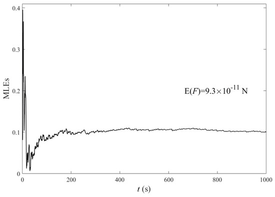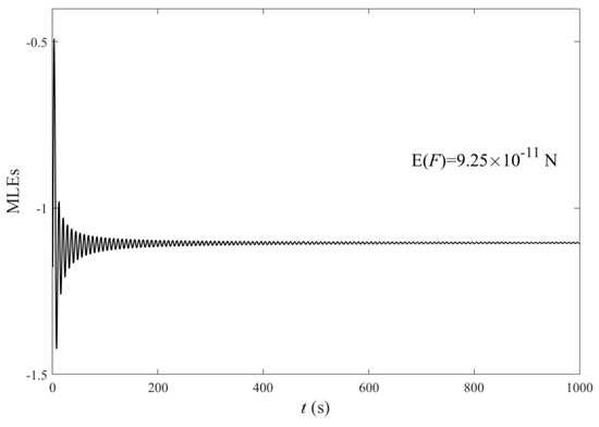 Figure 1 and Figure 2 show the Poincaré section when and , respectively. Figure 3 and Figure 4 show the maximum Lyapunov exponents (denoted by MLEs in the figures) when and , respectively.