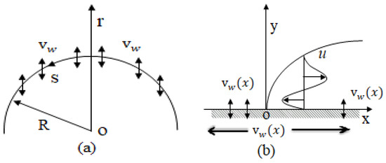 We discussed base micropolar fluids with the Buongiorno model at a permeable curved surface. In the flow direction, the arc length is , and the normal to tangent vector is which is shown in Figure 1a,b. Figure 1a,b shows the geometry of the stretching. The surface is stretched, where is in the -direction and c is constant, while occurs because of the porous surface, which characterizes two cases: and , which are related to injection and suction, respectively.