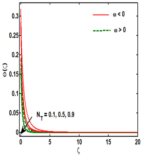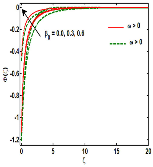 The present problem was solved numerically by using the bvp4c/shooting procedure. The effect of distinct parameters is graphically portrayed along the temperature and concentration profiles. Figure 2, Figure 3, Figure 4 and Figure 5 depict the variation in temperature profiles along the distinct values of flow parameters. Figure 2 shows that by enlarging the value of the unsteadiness parameter , the temperature profile declines for in the cases of both suction and injection. A physical increase in causes an increase in the thickness of the thermal layer. In Figure 3, the variation in the temperature plot is displayed against the thermophoresis parameter. Figure 3 shows the impacts of on the temperature profile. The temperature profile reduced due to increasing values of . Physically, is directly proportional to the heat thermal coefficient which arises with fluid; hence, the heat transfer rate at the surface diminishes. In Figure 4, the variation in the temperature plot is displayed against the thermal slip parameter. Figure 4 reveals that the value of increases when the temperature plot is reduced. Physically, is directly proportional to the heat thermal coefficient which arises with fluid; hence, the heat transfer rate at the surface diminishes. In Figure 5, it is shown that decreases with greater values of in the cases of both suction and injection. Figure 6 and Figure 7 illustrate the variation in the concentration field for altered values of physical parameters. Figure 6 shows the diversity in the concentration profile for different values of the unsteadiness parameter. It is clarified that the concentration field decreases for the parameter of in the cases of both suction and injection. Figure 7 shows that the concentration field is reduced due to enhancement in the values of .