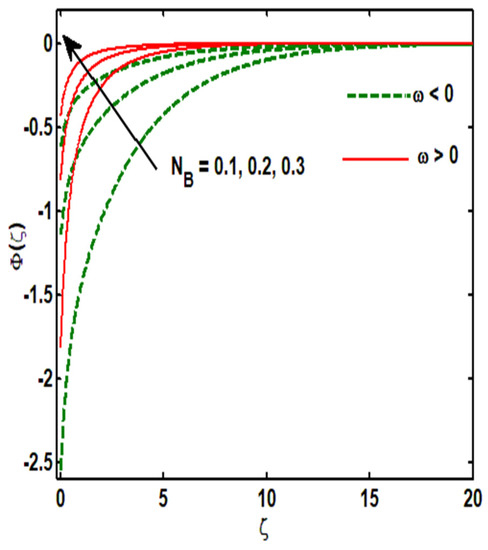 Table 1 and Table 2 present the influence of several physical parameters on the , , and for micropolar nanofluid. We also acknowledge the influence of strong and weak concentrations. The effects of on are shown. It is noted that increases as the value of decreases, because the thermal slip reduces the heat transfer rate on the curved surface. The value of declines in the case of a weak concentration correlated to a strong concentration. Thermal slip does not influence or . In terms of the impacts of on , , and , it is observed that the value of increases as the values of , , and increase, because the slip velocity increases, which increased in heat transfer, , or skin frictions because the motion of the fluid flow increases. The , , and values decline when a weak concentration is correlated to a strong concentration. In terms of the influence of on the , , and values, it is observed that the value of increases as the , , and values increase which increase in heat transfer, , and skin frictions due to the increase in the motion of the fluid flow. In terms of the influence of on the , , and , it is seen that the values of and decrease with an increase in due to the suction flow, which prevents any decreases in the skin friction and . Meanwhile, the value increases as the heat transfer rate increases. The , , and values decrease in the case of compared to when . In terms of the impact of on the , , and , it is seen that the and values decrease with an increase in due to the increased values of curvature, which force a reduction in the skin friction and values. Meanwhile, the value increases with larger values of because the increases in the values of the curvature parameter prevent the heat transfer rate at the surface from increasing. The , , and values decrease in the case of a weak concentration as compared to that of a strong concentration. In terms of the effects of on , , and , it is seen that the and values increase with an increase in because the values of the micropolar parameter are increased, which prevent any decreases in skin friction and . Meanwhile, the value decreases as the value of increases, because decreasing the values of the micropolar parameter forces reductions to the heat transfer rate at the surface to occur. In terms of the influence of on , , and , it is seen that the and values increase with an increase in because the skin friction enhances due to the heat, while declines with as the values of increase because radiation increases, which reduces the heat transfer rate at the surface. In terms of the impact of on , it is noted that increases as increases because the small number of nanoparticles enhances the heat transfer rate of the wall. There are no effects of thermal slip on and . The impact of on is shown. It is noted that increases with decreased due to the collision of fluid and nanoparticles, which reduce the heat transfer rate at the surface. No impacts of on or were found. In terms of the effects of on , , and , it is seen that the and values increase with an increase in , while decreases with larger values of , because the decreasing values of unsteadiness force a decline in the heat transfer rate at the surface. Table 3 compares the present analysis with Nogrehabadi et al. [36] and Sahoo and Do [37] for with diverse values of the suction parameter.