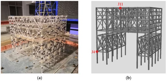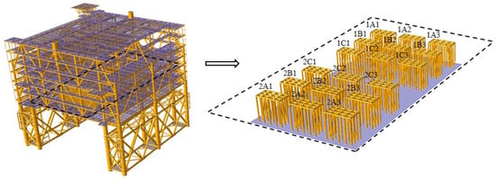 A physical model experiment was conducted to verify the numerical model of the offshore converter platform project. The model parameters were calculated based on the similarity law for elasticity with a geometric scale of 1:60. The physical model is shown in the left image and the numerical model was built using SACS 15.0 (Bentley Systems, Incorporated, Louisiana, USA) in the right image in Figure 1.