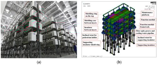 The valve tower and its finite element model: (a) Valve tower; (b) Finite element model of the valve tower.