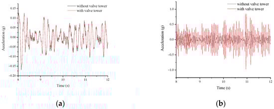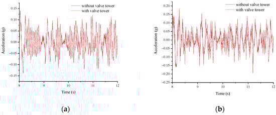 An overall model of the offshore converter platform was built to analyze the coupling relationship between the converter platform structure and the valve towers. Node J4 in the platform jacket and node J11 in the upper component were chosen for observation to exclude the influence of the detailed model of the valve tower itself on the vibration features. As shown, the acceleration responses of the overall structure with and without the valve tower were in agreement (see Figure 4). This indicates that the detailed modeling of the valve tower had little impact on the overall structure.