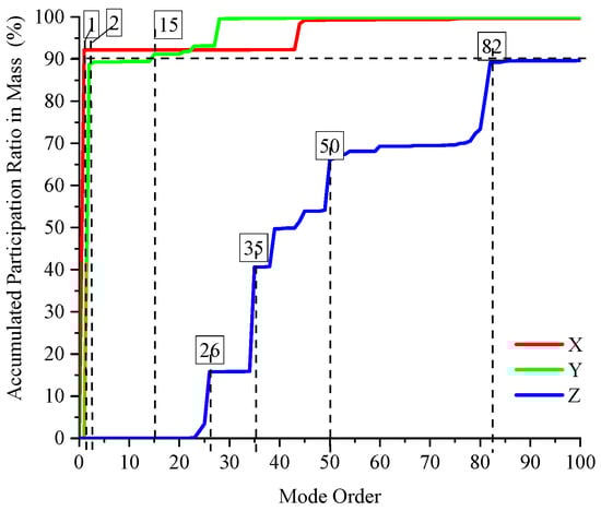 The accumulated participation ratio in mass of the offshore converter platform for the vibration modes of the first 100 orders.