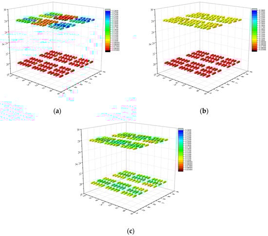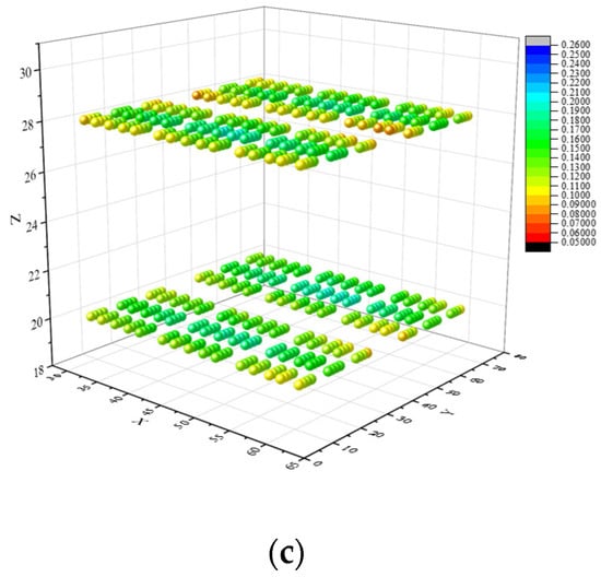 The peak acceleration response of the nodes in the foundation of the valve tower under earthquake ground-motion #1 input after optimization: (a) X-direction; (b) Y-direction; (c) Z-direction.