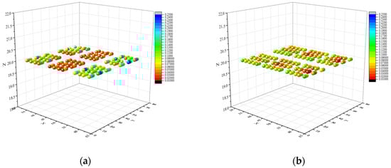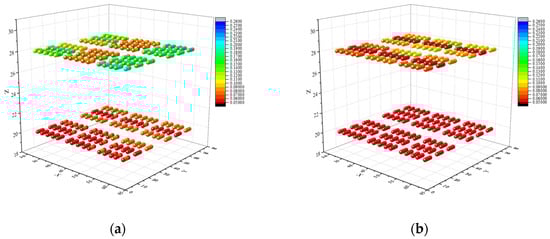 Furthermore, the most adverse load action on the valve tower is the relative subsidence of the foundation nodes. This load action was explored by comparing the peak difference in vertical displacement between two adjacent nodes among a total of 20 nodes in each group of the valve tower, as shown in Figure 10. The results showed that the maximum relative subsidence was 1.3‰ in the X-direction and 0.9‰ in the Y-direction. This finding implies that it is necessary to improve the structural strength of the valve tower itself or the foundation stiffness under deadweight working conditions (e.g., the relative subsidence of the foundation is required to be lower than 1‰–2‰) when applying conventional performance requirements (e.g., the relative subsidence of the foundation is required to be lower than 2‰–3‰) for the onshore valve tower to the offshore converter platform.