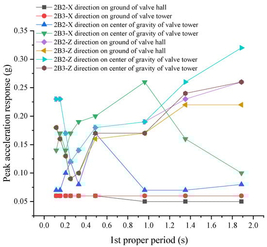 While ensuring that sufficient truncated modes were present for the calculation (N = 100), the influence of the valve tower stiffness on the calculation results was further explored. Different from the study of Günay and Mosalam on the influence of support structure stiffness on the seismic response of insulator posts [32], this paper carries out a sensitivity analysis on the stiffness of the whole valve tower. Table 3 shows the first-order natural frequency (X-direction) of the valve tower when the elastic modulus changes. The floor response spectra are plotted on this basis, as shown in Figure 11. When the valve stiffness could be appropriately improved based on the existing engineering design such that the first-order natural frequency fell within the interval (2.0 Hz, 5.0 Hz), the acceleration response at each site and in each direction could be controlled within 0.2 g.