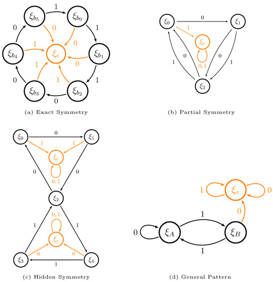 Finally, Figure 1d gives an example of a general nonnull pattern that is not an exact, partial, or hidden symmetry. This is the well-known Even Shift [31,33]—the set of binary strings in which only even blocks of 1s bounded by 0s are allowed. This pattern extends to arbitrary lengths, despite being specified by only two internal states. While there are no states in the presentation that always return to themselves after transitions, there is still predictive regularity. In particular, if a 1 is seen after a 0, it is guaranteed that the next symbol will be a 1. This is specified by having only one allowed transition to on a 1. Appendix A.2 discusses this example in more detail, along with its semigroup and three semiautomaton presentations.