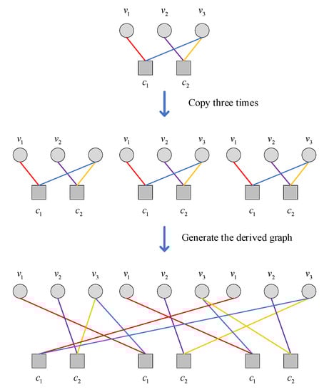 Protograph LDPC codes define a subclass of multi-edge type LDPC (MET-LDPC) codes, which allow extending a base matrix or graph prototype (base graph) to a complete matrix or graph [28]. A well-designed protograph LDPC code can achieve better performance and is suitable for an efficient encoding/decoding implementation [29,30]. A protograph can be represented by a tanner graph with a relatively small number of nodes, which consists of three sets, , and , corresponding to variable nodes (VNs), check nodes (CNs), and the connecting edges, respectively. Each edge connects a VN to a CN . A graphical example of generating the derived graph is shown in Figure 1. An protograph code (an equivalent LDPC code) is derived by using a process known as lifting, where and equals the number of VNs and CNS in the derived tanner graph corresponding to the base protograph graph, respectively. The lifting process utilizes the copy-and-permutation operation. The number of copy times is decided by the lifting factor , where .