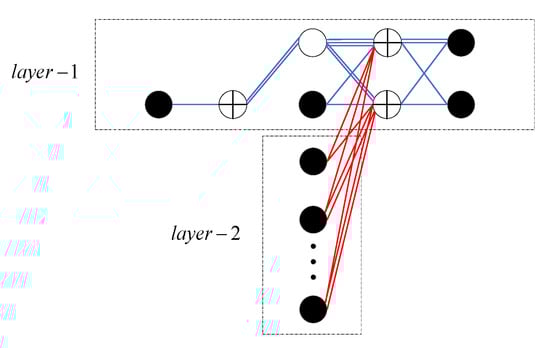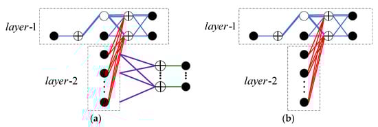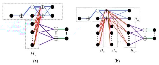 Figure 5a,b show the iterative decoding factor graphs in decoder1 and decoder2. In Figure 5a, the variable nodes in layer-2 are checked by the parity check matrix . The additional Log-Likelihood Ratio (LLR) of variable nodes in layer-2 provide help for decoding the variable nodes in layer-1. We can see that the message from the check node to the variable node is