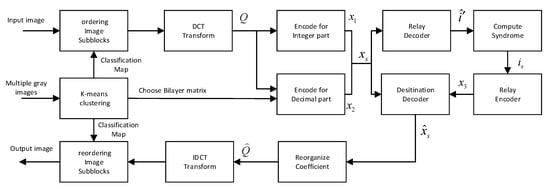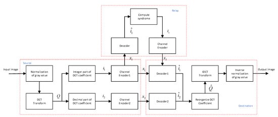 For practical purposes, we consider gray images as research objects for the UEP strategy in this paper. A new UEP scheme (UEP-1) system model in a half-duplex relay system is shown in Figure 4. After block discrete cosine transform (DCT) [32,33] processing of the input image, we found that each DCT coefficient can be divided into two parts—the integer part and the decimal part , where is approximated by retaining the binary number of bits. The recovery performance of the image is dependent on the size of . The degradation coefficients can be represented as