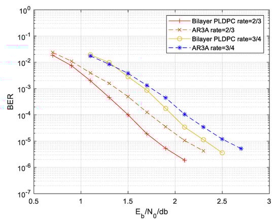 Figure 8 shows the end-to-end performance comparison of different bilayer PLDPC code and the conventional AR3A code in half-duplex relay system. It is observed that the bilayer PLDPC codes had performance gains of 0.3 dB and 0.2 dB over the AR3A code at rates of 2/3 and 3/4, respectively.